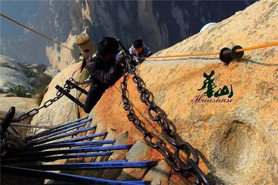 懸空千米,華山長(zhǎng)空棧道更換腐朽木板