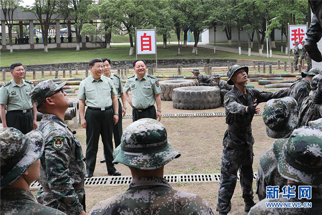 5月21日,中共中央總書記、國家主席、中央軍委主席習近平到陸軍步兵學院視察。這是習近平觀看學員進行極限訓(xùn)練。新華社記者 李剛 攝