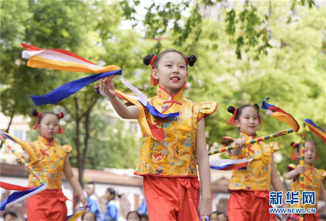 當日,內(nèi)蒙古呼和浩特市新城區(qū)滿族小學(xué)舉辦“繽紛民族情 炫彩花棍舞”主題活動,學(xué)生們身著艷麗的滿族服飾,跳起優(yōu)美飄逸的滿族花棍舞,在濃郁的民族文化氛圍中迎接即將到來的“六一”兒童節(jié)。 新華社發(fā)(王正 攝)