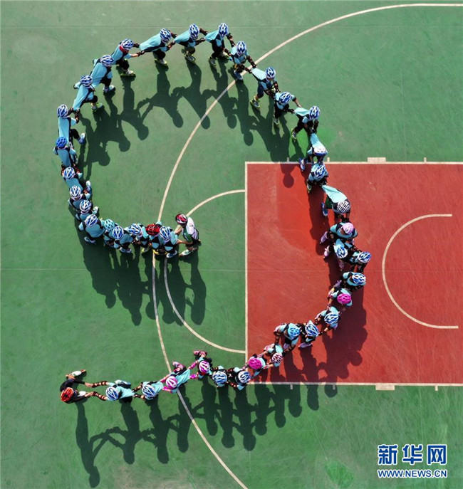 6月11日,學(xué)生輪滑隊(duì)員在遵化市第六實(shí)驗(yàn)小學(xué)進(jìn)行訓(xùn)練(無人機(jī)拍攝)。