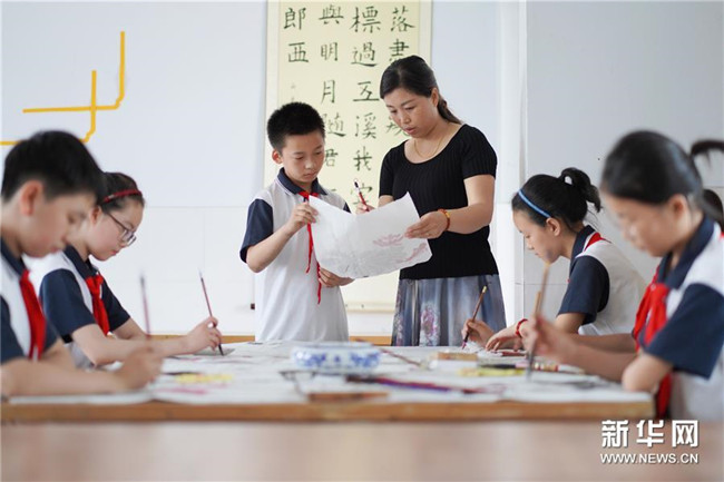 6月26日,內(nèi)丘縣實(shí)驗(yàn)小學(xué)老師在指導(dǎo)學(xué)生練習(xí)國(guó)畫(huà)創(chuàng)作。新華社記者 朱旭東 攝