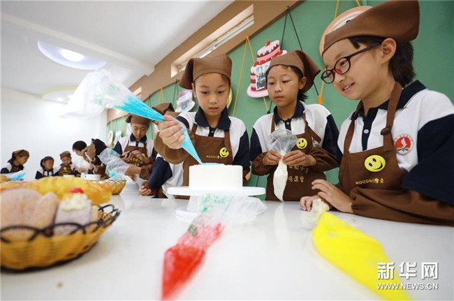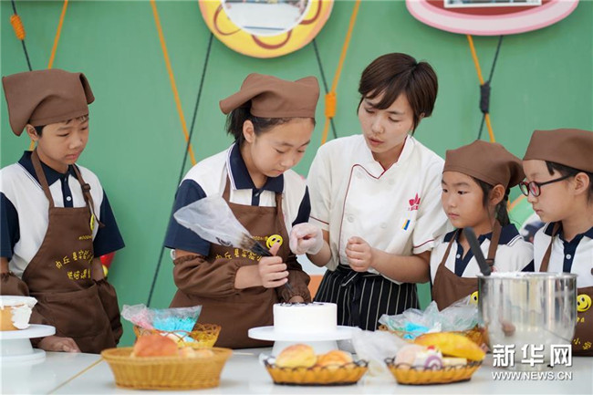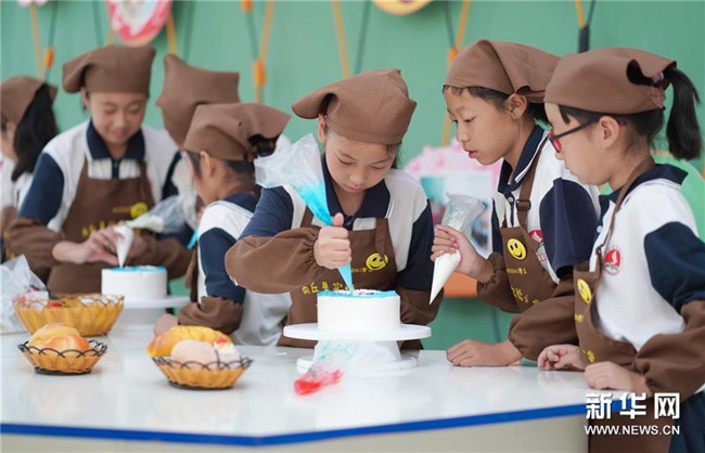 6月26日,內(nèi)丘縣實(shí)驗(yàn)小學(xué)學(xué)生在烘焙課堂制作糕點(diǎn)。 新華社記者 朱旭東 攝