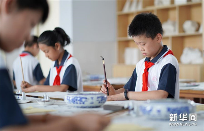 6月26日,內(nèi)丘縣實(shí)驗(yàn)小學(xué)學(xué)生在參加書(shū)法特色課程。 新華社記者 朱旭東 攝