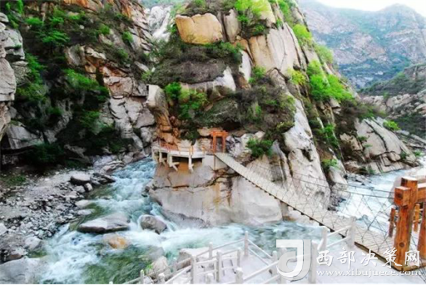 踏進(jìn)峪口,頭頂是遮天蔽日的綠色,四周水聲潺潺,鳥(niǎo)鳴悅耳,空谷幽靈,沉靜自然,涼爽的山風(fēng)夾雜著花草的芳香,瞬間就滋潤(rùn)了燥熱的心情。迎著溪谷逆水而上,山的奇特與水的靈秀交織在一起,伴著水聲,綿延著向更遠(yuǎn)處伸展。若有情致,卷起褲腿,或穿上沙灘鞋,或赤足,踏著被溪水長(zhǎng)久沖刷平整光滑的大石頭,任由清涼通透的溪水撫摸雙足,沁心入骨,仿佛拾回了童年的歡樂(lè),煩擾憂愁全無(wú)蹤影。臨水而筑的棧道,全程依水而行,曲徑通幽,每轉(zhuǎn)一道彎,都是一幅新景。