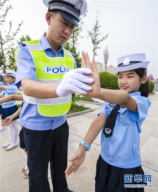 7月9日,武邑縣公安交警大隊的民警指導“小交警”學習交通指揮手勢。新華社記者 李曉果 攝