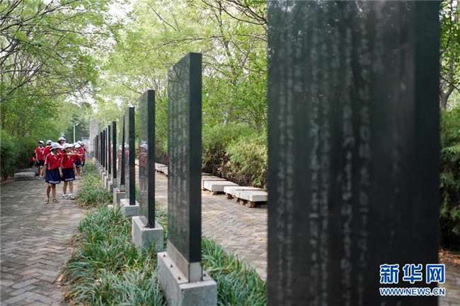 7月13日,河北省邢臺(tái)市巨鹿縣育新小學(xué)學(xué)生在愛(ài)華翰苑碑林參觀。