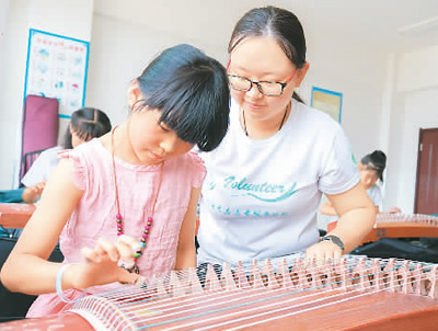 圖為志愿者指導實驗小學鄉(xiāng)村少年宮孩子們練習古箏。(來源:人民圖片)