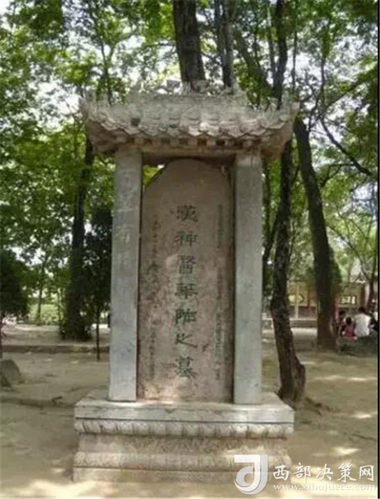 神醫(yī)華佗墓,在石舫東邊的巨石旁,有一《漢神醫(yī)華陀墓》碑。華陀死后并沒葬于此,但為什么有墓碑呢?據(jù)《后漢書•華陀傳》記載:當(dāng)年華陀有一好友名魯先生隱居在華山白麓龕,華陀常來華山探友,且常留住這里,和魯先生一起作五禽游戲,一起采藥、制藥濟(jì)世。他在平時總愛穿戴魯先生的道袍方巾,腰系一個大藥葫蘆,下山為百姓診治疾病。被曹操殺害后,冤魂直來華山,向好友訴屈。魯先生驚覺,即下山探詢,獲得確實噩耗后,魯先生把華陀衣物用具在紅巖村西修了一座衣冠冢,并且嚎啕痛哭送葬?,F(xiàn)墓已無存,也不知何時何人將墓碑移至玉泉院內(nèi)。