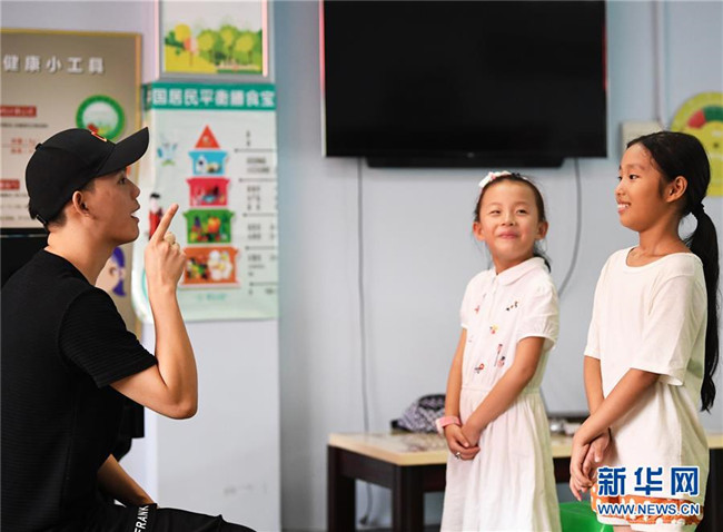 8月5日,培訓(xùn)班老師(左)在課堂上與小朋友們互動。新華社記者 王全超 攝