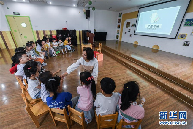 當(dāng)日,浙江省湖州市織里鎮(zhèn)晟舍幼兒園的小朋友們迎來了開學(xué)第一課——垃圾分類課。幼兒園通過請小朋友觀看幻燈片、動畫短片以及進(jìn)行趣味游戲等方式,讓孩子們在開學(xué)之初了解垃圾分類知識和垃圾分類的重要性。據(jù)了解,織里鎮(zhèn)所有幼兒園和中小學(xué)目前都已經(jīng)將垃圾分類常識課放入到學(xué)校日常課程中。 新華社記者 徐昱 攝