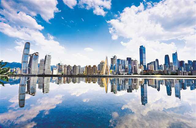 九月十一日,倒映水中的藍(lán)天白云和渝中半島。特約攝影 鐘志兵