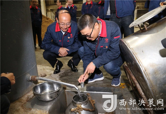 西鳳集團(tuán)公司領(lǐng)導(dǎo)班子成員還詳細(xì)查看了窖池發(fā)酵情況,現(xiàn)場和工人師傅們一起裝甑餾酒,為大家鼓勁加油!