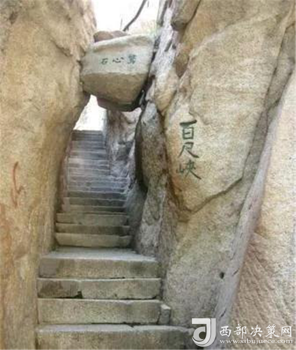 出千尺幢不遠(yuǎn)是百尺峽,這里是登山第二道險(xiǎn)關(guān)。雖沒有千尺幢那么長(zhǎng),僅46米,石階91級(jí),但仍是華山天險(xiǎn)之一。這里勢(shì)危坡陡,石壁峭立,通道狹窄,且有懸石,搖搖欲墜。游人至此都心驚膽顫。明顧端木有詩狀其險(xiǎn)曰:"幢去峽復(fù)來,天險(xiǎn)不可瞬。雖云百尺峽,一尺一千仞。"千尺幢、百尺峽的臺(tái)階都是從明末清初開始鑿的,民國時(shí)幾經(jīng)加固,解放后又多次修整,一九八五年又鑿復(fù)道,游人上下各行其道。