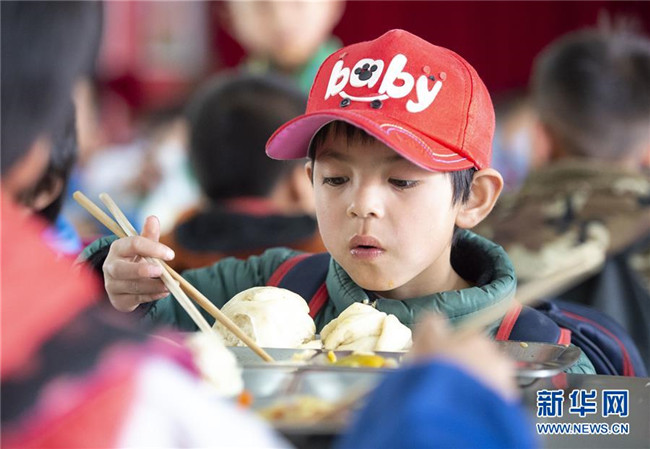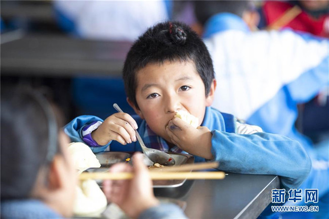 在西吉縣田坪鄉(xiāng)中心小學(xué),學(xué)生在享用免費(fèi)營養(yǎng)午餐(10月23日攝)。
