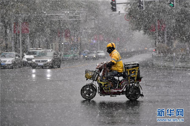 10月31日,在青海省西寧市,一名外賣配送員在雪中騎行。新華社記者張龍攝