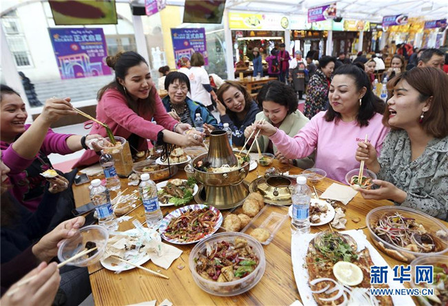 11月2日,游客在大巴扎冰屋美食街品嘗免費(fèi)美食。