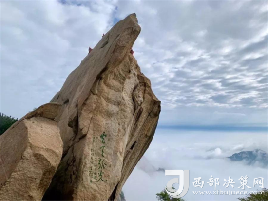 整個西峰為一塊渾然天成的巨石,北面臨空,懸崖絕壁如刀削鋸截,東西兩側(cè)狀如蓮花,因此也稱“蓮花峰”,這里更是“劈山救母”、“寶蓮燈”等傳說故事的發(fā)生地。