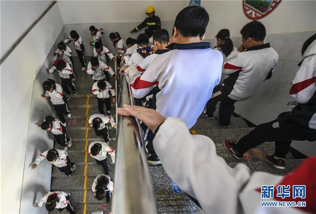11月8日,河北省大廠回族自治縣城關(guān)小學(xué)的學(xué)生們?cè)谛@內(nèi)參加模擬逃生演練。新華社記者李曉果攝