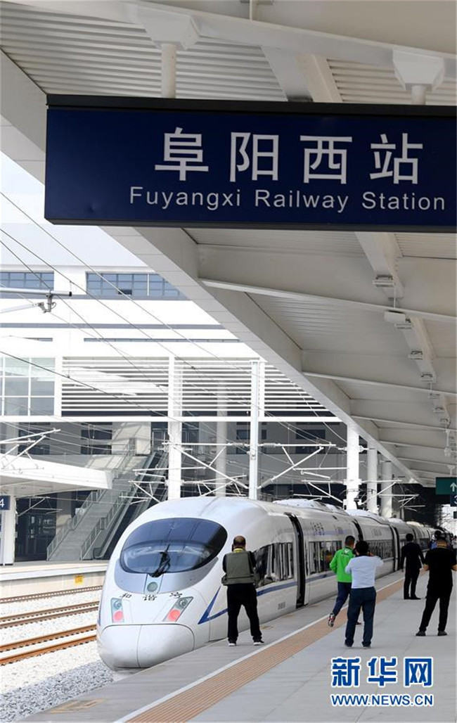 10月24日,一輛試運(yùn)行列車??吭谏毯虾几哞F阜陽西站。 新華社記者劉軍喜攝