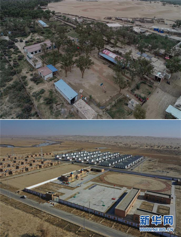 拼版照片:上圖為易地扶貧搬遷前的新疆于田縣達(dá)里雅布依鄉(xiāng)學(xué)校全景(2018年9月7日無人機(jī)拍攝);下圖為達(dá)里雅布依鄉(xiāng)易地扶貧搬遷安置點的學(xué)校新貌(2019年11月19日無人機(jī)拍攝)。新華社記者胡虎虎攝