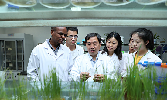 西北農林科技大學旱區(qū)作物逆境生物學國家重點實驗室小麥-條銹菌互作室里,“小麥癌癥”攻克者康振生院士正指導學生觀察酵母菌落培養(yǎng)情況。張勁松攝