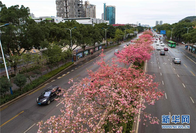 這是美麗異木棉花競(jìng)相綻放的廣西柳州市東環(huán)大道(12月1日無(wú)人機(jī)拍攝)。新華社記者 黃孝邦 攝