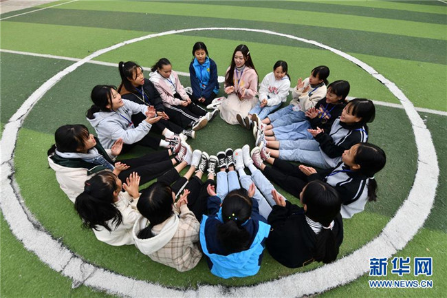 12月5日,在廣西融水苗族自治縣保桓中學(xué),林洋港(右三)和學(xué)生們在球場上玩游戲。林洋港是西北工業(yè)大學(xué)的在讀碩士研究生,今年9月來到融水苗族自治縣?;钢袑W(xué)任物理老師。新華社記者 黃孝邦 攝
