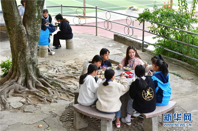 12月5日,在廣西融水苗族自治縣保桓中學(xué),林洋港(正面,右一)和學(xué)生們在校園里吃午飯。林洋港是西北工業(yè)大學(xué)的在讀碩士研究生,今年9月來到融水苗族自治縣?;钢袑W(xué)任物理老師。 新華社記者 黃孝邦 攝