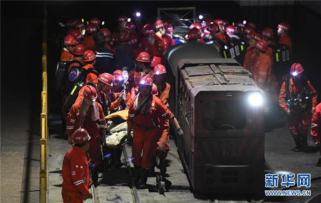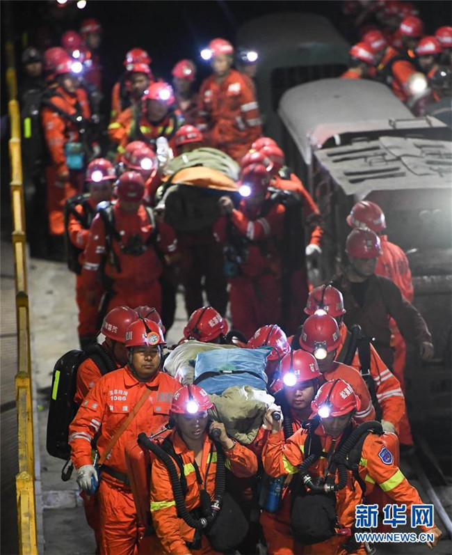 12月18日,救援人員轉(zhuǎn)運安全升井的被困人員。新華社記者 薛玉斌 攝