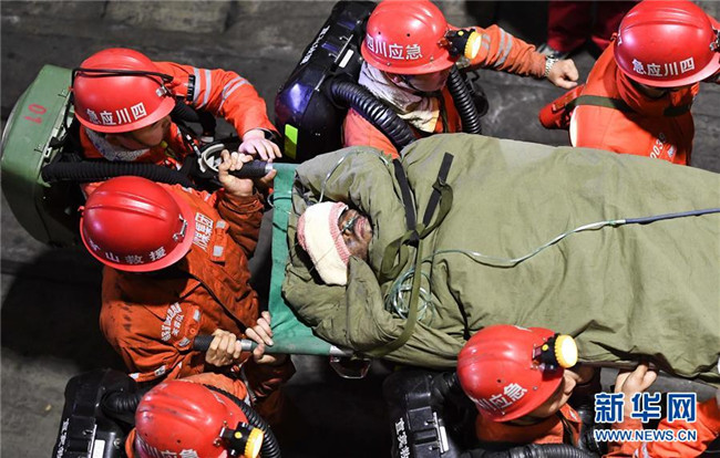 12月18日,救援人員轉(zhuǎn)運安全升井的被困人員。 當(dāng)日7時56分,經(jīng)過80多個小時的緊張救援,發(fā)生透水事故的川煤集團杉木樹煤礦13名被困人員全部安全升井。 新華社記者 薛玉斌 攝