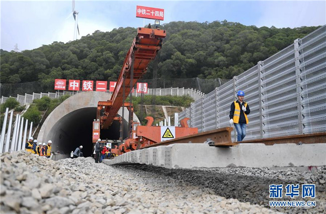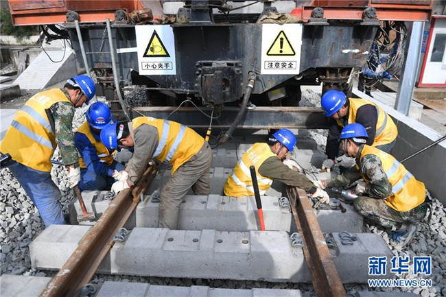 12月22日,中鐵二十四局工作人員在平潭海峽公鐵大橋鋪軌施工現(xiàn)場(chǎng)進(jìn)行鋪軌作業(yè)。新華社記者 林善傳 攝