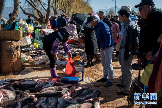 12月25日,人們在星云湖畔的老河咀魚市選購剛捕撈的鮮魚。新華社記者 胡超 攝