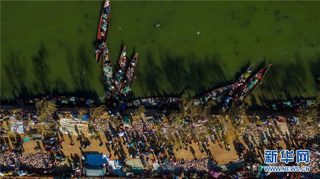 星云湖畔的老河咀魚市熱鬧非凡(12月25日無人機拍攝)。新華社記者 胡超 攝
