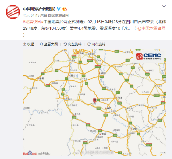 四川自貢市榮縣發(fā)生4.4級(jí)地震 震源深度10千米