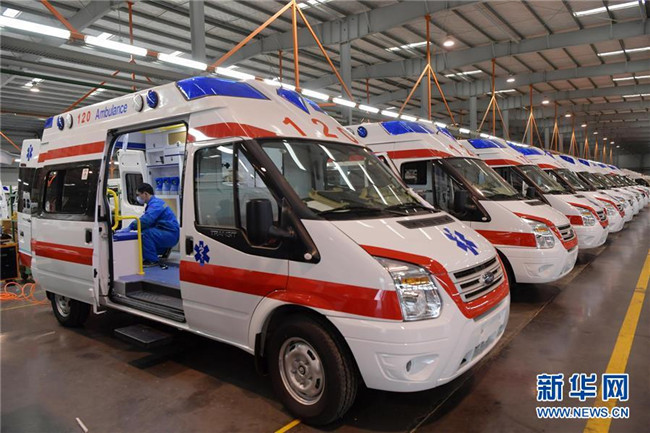 在江西江鈴汽車集團(tuán)改裝車股份有限公司負(fù)壓救護(hù)車生產(chǎn)基地內(nèi),工作人員在負(fù)壓救護(hù)車生產(chǎn)線上進(jìn)行裝配調(diào)試(2月6日攝)。 新華社記者 彭昭之 攝
