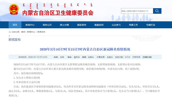 3月15日,記者從內蒙古自治區(qū)衛(wèi)生健康委員會獲悉,2020年3月14日7時至15日7時,內蒙古自治區(qū)報告無新增新冠肺炎確診病例,無新增疑似病例,無新增治愈出院病例。