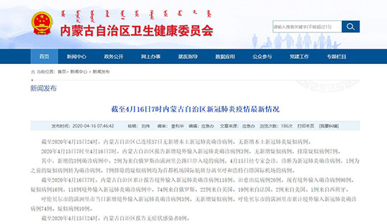 2020年4月15日7時(shí)至4月16日7時(shí),內(nèi)蒙古自治區(qū)報(bào)告新增境外輸入新冠肺炎確診病例3例,無(wú)新增疑似病例,排除疑似病例7例。