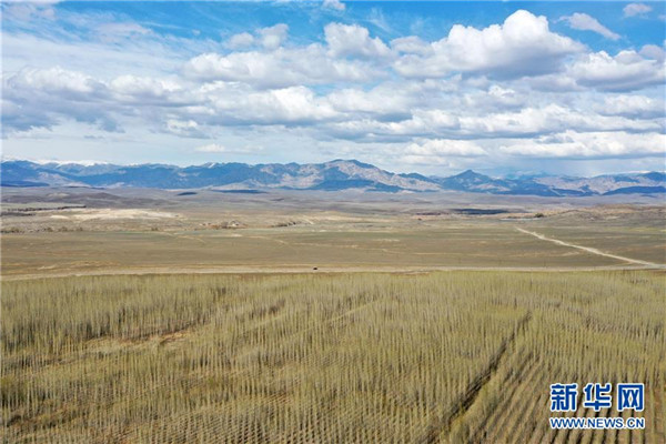 與阿勒泰市中水回用環(huán)境治理示范園林地一路之隔的就是戈壁灘(4月19日攝,無人機(jī)照片)。新華社記者丁磊攝