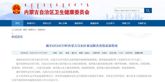 截至2020年4月22日24時,內(nèi)蒙古自治區(qū)報告無癥狀感染者0例。