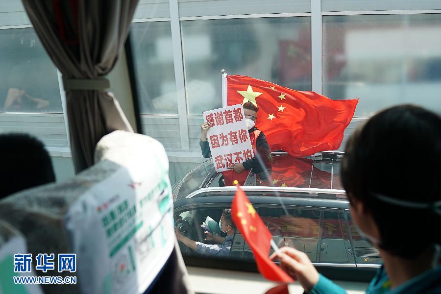 歡送的人群舉著橫幅——“感謝北京,因為有你,武漢不怕”“致敬最美逆行者”等標語在陽光下閃動。
