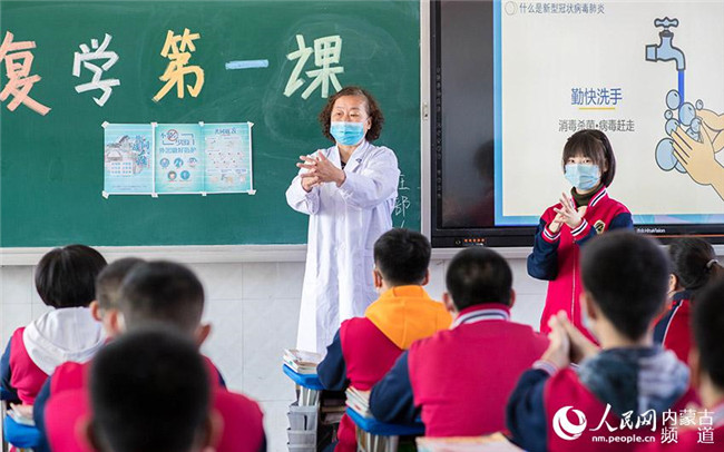 內蒙古呼和浩特市第十二中學校醫(yī)為學生講解疫情防護知識和衛(wèi)生常識,上好開學第一課。