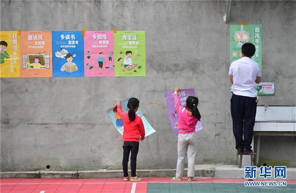 在廣西融水苗族自治縣桿洞鄉(xiāng)黨鳩小學(xué),師生們在校園里張貼海報(bào)(5月13日攝)。新華社記者黃孝邦攝