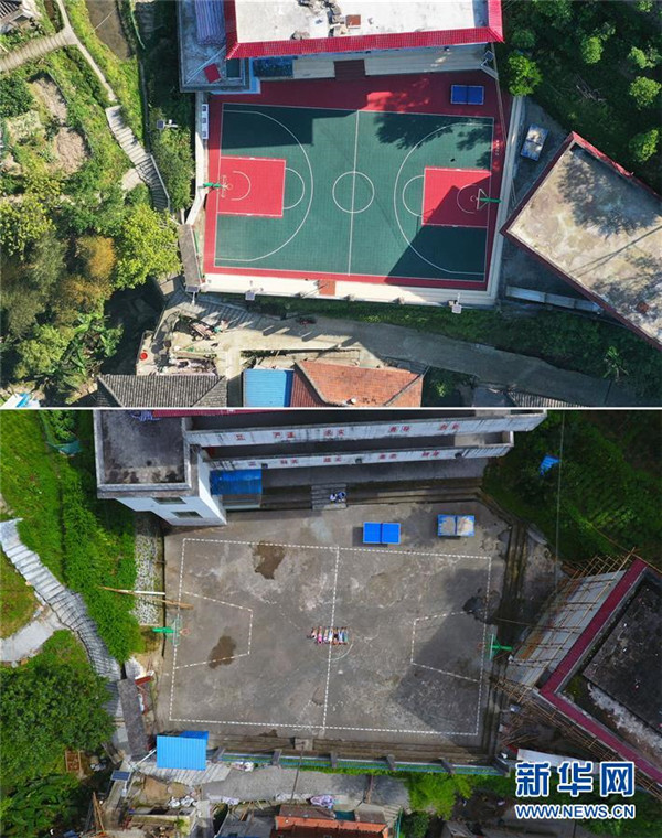 這張拼版照片的上圖為完成改造后的黨鳩小學(xué)塑膠球場(2020年4月15日攝,無人機(jī)照片);下圖為黨鳩小學(xué)改造前的球場(2019年7月5日攝,無人機(jī)照片)。新華社記者黃孝邦攝