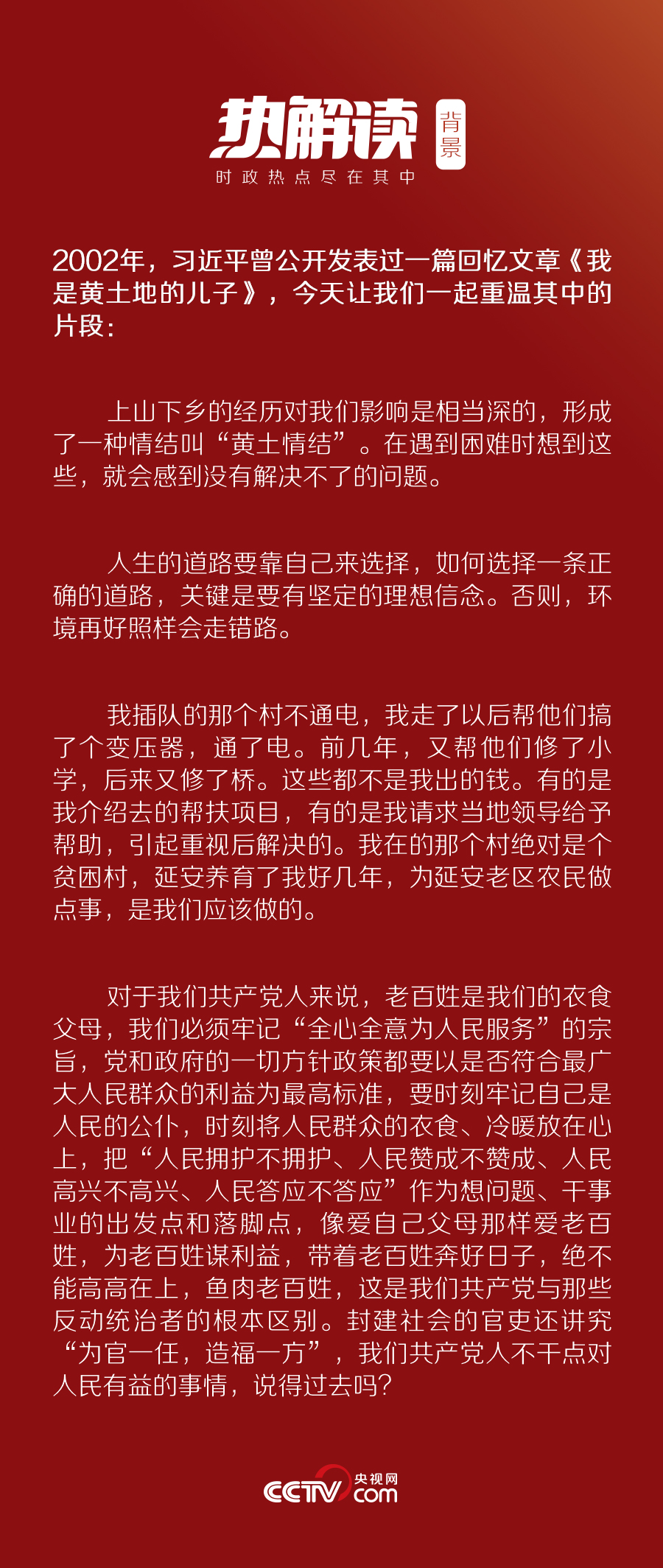 早在十幾年前,習近平就曾在《我是黃土地的兒子》一文中提到過“情結”二字。他說,上山下鄉(xiāng)的經(jīng)歷對我們影響是相當深的,形成了一種情結叫“黃土情結”。