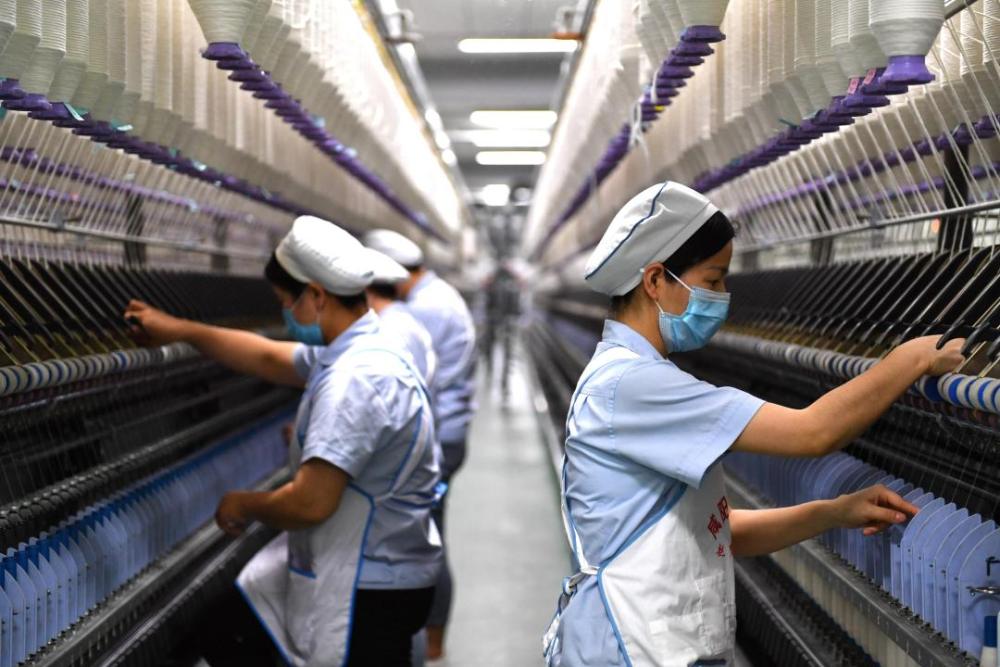 在抗擊新冠肺炎疫情過程中,陜西省咸陽紡織集團有限公司一分廠紡織工人堅守在復工復產(chǎn)一線,搶抓工時完成生產(chǎn)任務。(新華社記者張博文 攝)