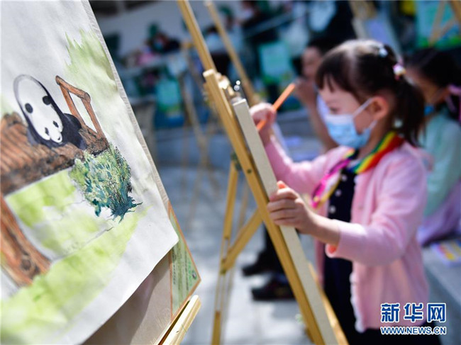 5月31日,小朋友在西寧熊貓館內(nèi)繪畫。 新華社記者 張龍 攝