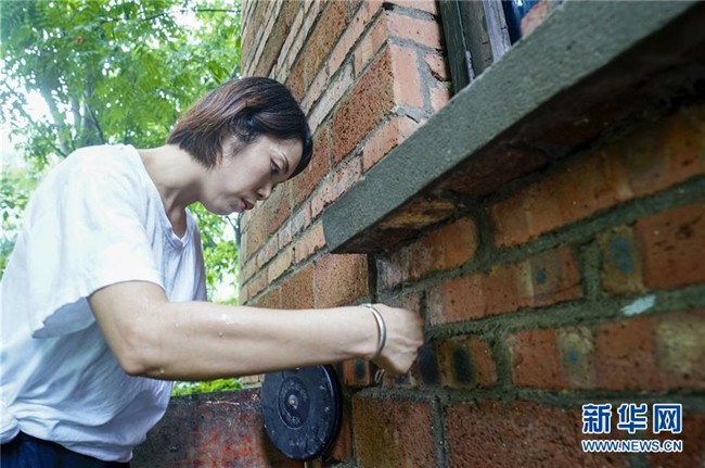 7月1日,地質(zhì)災害監(jiān)測員侯芳對一處農(nóng)房的墻上裂縫寬度進行測量。 新華社記者 劉潺 攝