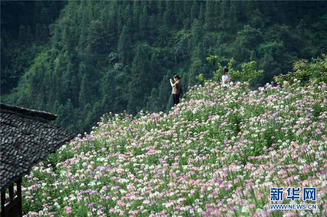 7月6日,游客在龍勝各族自治縣泗水鄉(xiāng)周家村布尼梯田鮮花叢中拍照。