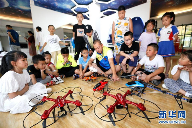 7月12日,山東省青島市即墨區(qū)環(huán)秀街道濱湖社區(qū)科普館工作人員在給小學(xué)生講解無人機(jī)飛行常識。新華社發(fā)(梁孝鵬 攝)