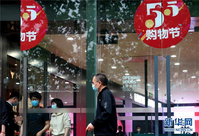 這是上?;春B芬患疑虉龅?ldquo;五五購物節(jié)”標(biāo)識(5月5日攝)。5月4日晚,上海首次啟動大規(guī)模商業(yè)促銷活動“五五購物節(jié)”,多家在線新經(jīng)濟企業(yè)參與。 新華社記者 劉穎 攝